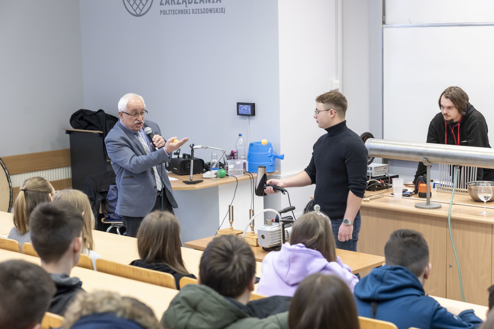 Wydarzenie uświetniły ciekawe pokazy przygotowane przez koła naukowe działające na naszej uczelni. KN „ESPRIT” z Wydziału Chemicznego zapewniło wiele „wybuchowych” niespodzianek, KN „FOTON” z Wydziału Matematyki i Fizyki Stosowanej zademonstrowało wybrane prawa i zjawiska fizyczne, natomiast Koło Naukowe MegaVolt z Wydziału Elektrotechniki i Informatyki zaprezentowało pokaz wysokich napięć.